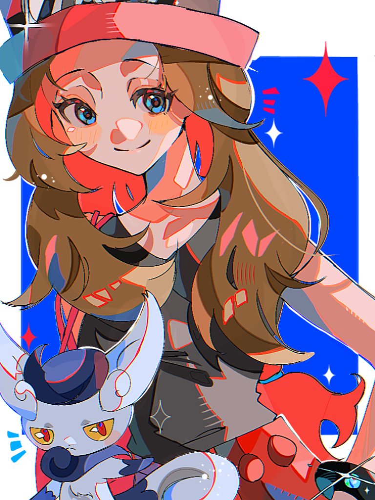 1girl black_shirt blue_eyes closed_mouth eyewear_on_headwear gen_6_pokemon hami_(3hm6gebdf619771) hat light_brown_hair long_hair meowstic meowstic_(female) nintendo pokemon pokemon_(creature) pokemon_xy red_hat serena_(pokemon) shirt sleeveless sleeveless_shirt smile split_mouth sunglasses white-framed_eyewear