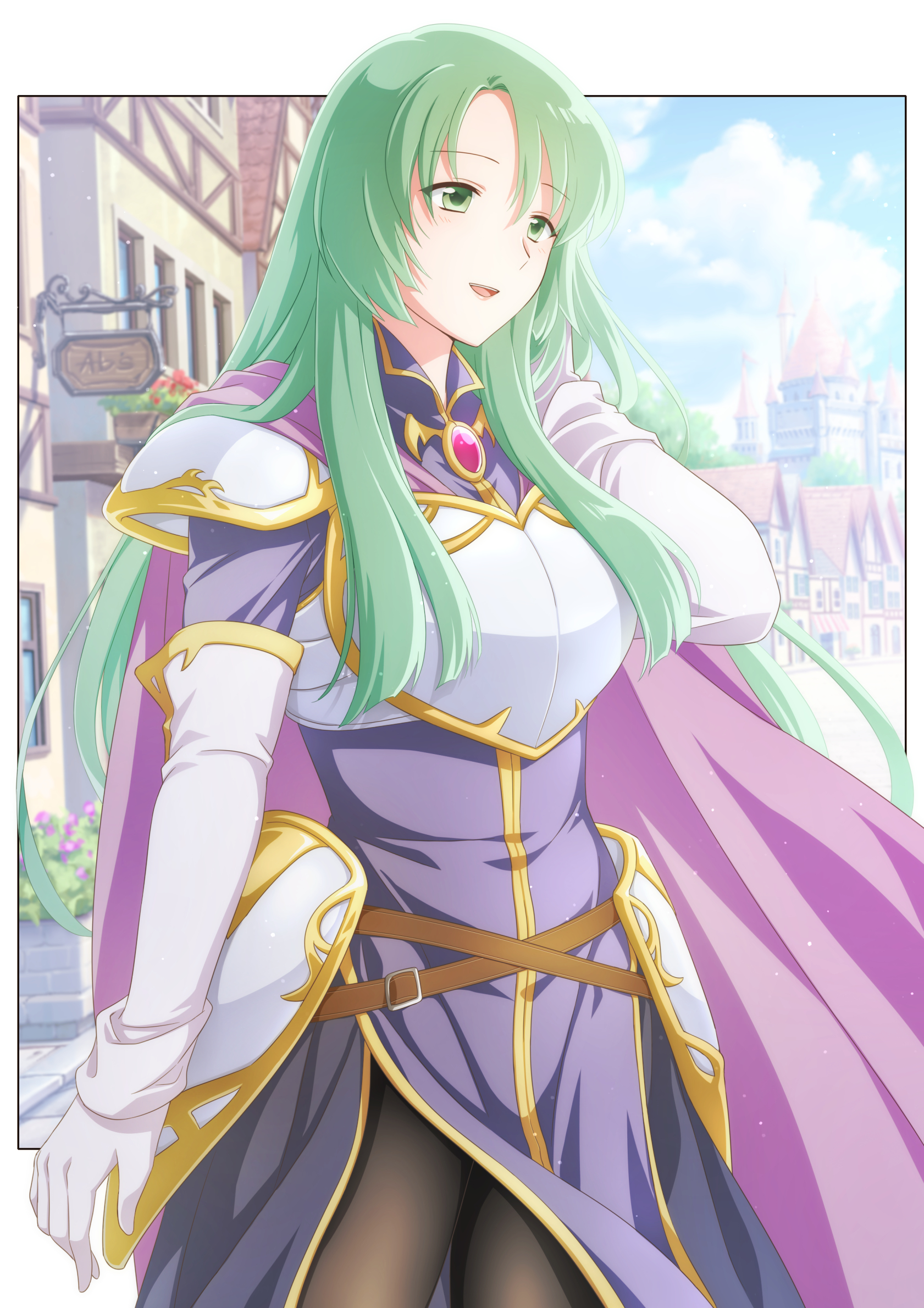 1girl armor black_pantyhose blue_sky breastplate cape cecilia_(fire_emblem) dress elbow_gloves fire_emblem fire_emblem:_the_binding_blade gloves green_eyes green_hair ham_pon highres long_hair looking_to_the_side nintendo pantyhose purple_cape purple_dress shoulder_armor sky smile solo textless_version town white_gloves