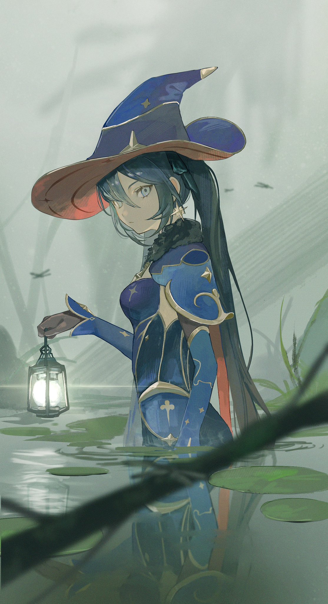 1girl black_gloves black_hair blue_capelet blue_hat blue_leotard blue_sleeves breasts capelet detached_sleeves earrings elbow_gloves from_side fur_collar genshin_impact gloves green_eyes hair_between_eyes hair_ornament hat highres holding holding_lantern jewelry lantern leotard lily_pad long_hair looking_at_viewer lotus_leaf medium_breasts mona_(genshin_impact) outdoors pond solo star_(symbol) star_earrings sushi_gnsn twintails wading water witch_hat