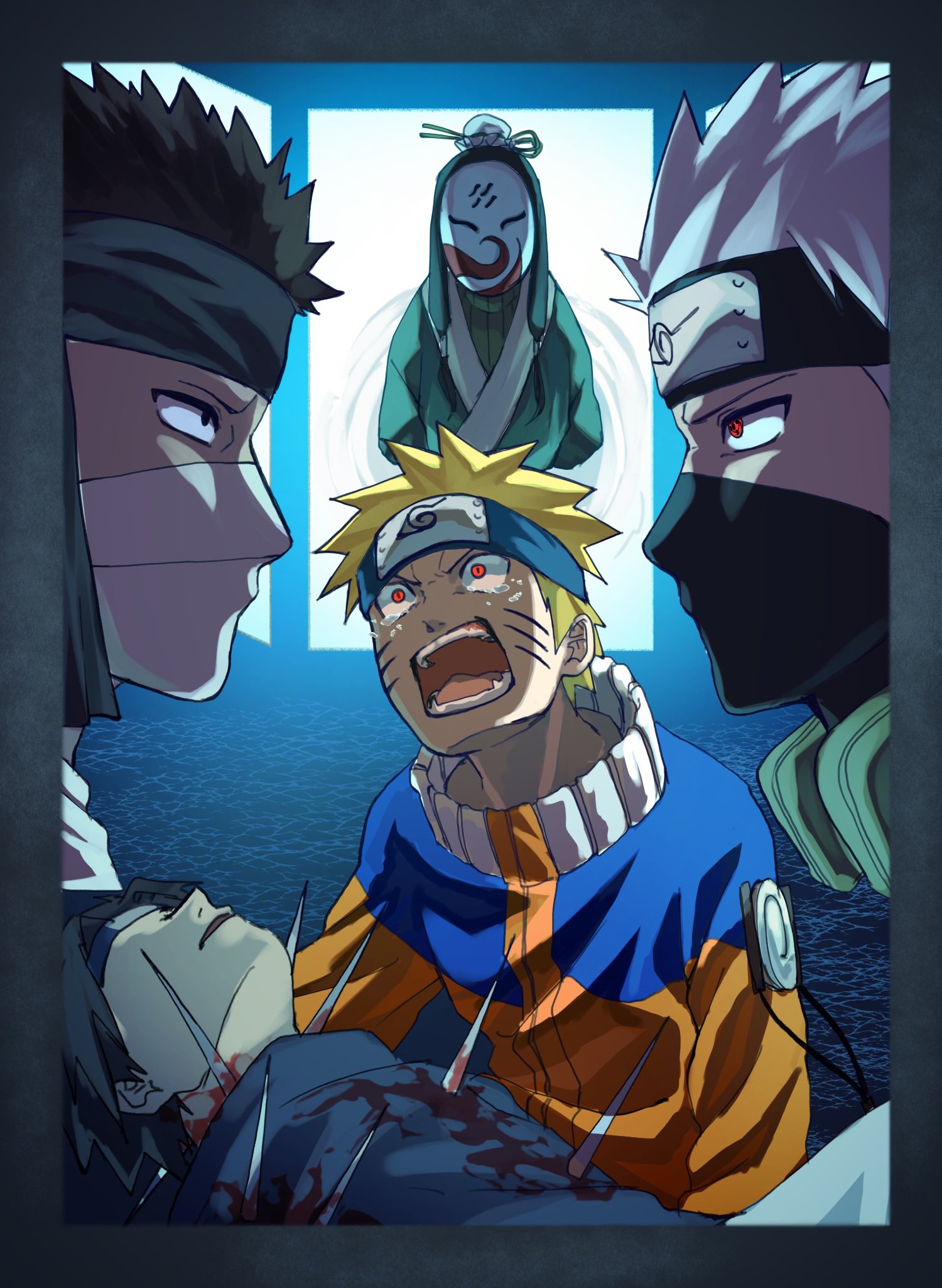 5boys black_hair black_mask blonde_hair blood blood_on_clothes blue_jacket blue_shirt facial_mark forehead_protector haku_(naruto) hatake_kakashi highres jacket konohagakure_symbol male_focus mask momochi_zabuza mouth_mask multicolored_jacket multiple_boys naruto_(classic) naruto_(series) open_mouth orange_jacket pnpk_1013 red_eyes sharingan shirt short_hair teeth two-tone_jacket uchiha_sasuke uzumaki_naruto whisker_markings white_hair