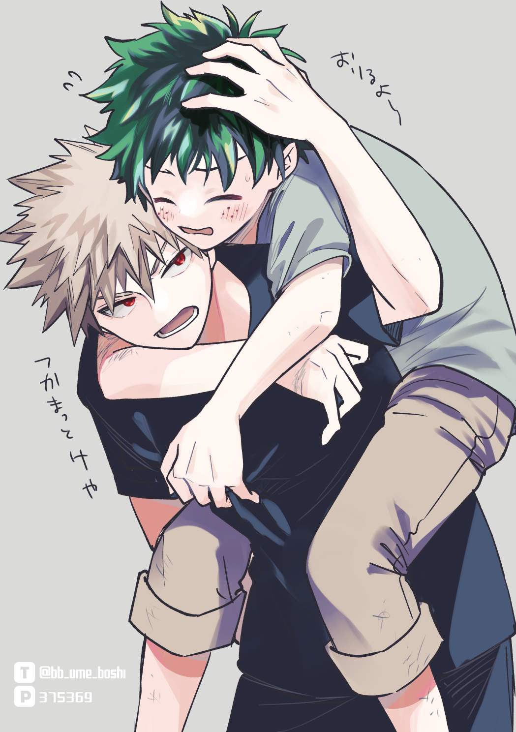2boys bakugou_katsuki black_pants black_shirt blonde_hair blush boku_no_hero_academia brown_pants carrying closed_eyes freckles from_behind green_hair highres male_focus midoriya_izuku multiple_boys open_mouth pants red_eyes shirt short_hair spiked_hair teeth ume_(326310)