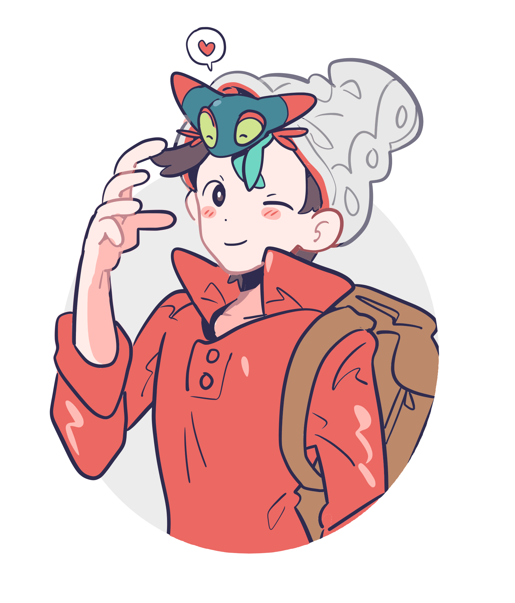 1boy ;) backpack bag beanie blush_stickers bright_pupils brown_bag closed_mouth collared_shirt commentary_request dreepy gen_8_pokemon gogeyama hand_up hat heart highres looking_at_viewer male_focus nintendo on_head one_eye_closed pokemon pokemon_(creature) pokemon_on_head pokemon_sword_and_shield popped_collar red_shirt shirt simple_background smile spoken_heart victor_(pokemon) white_background white_pupils