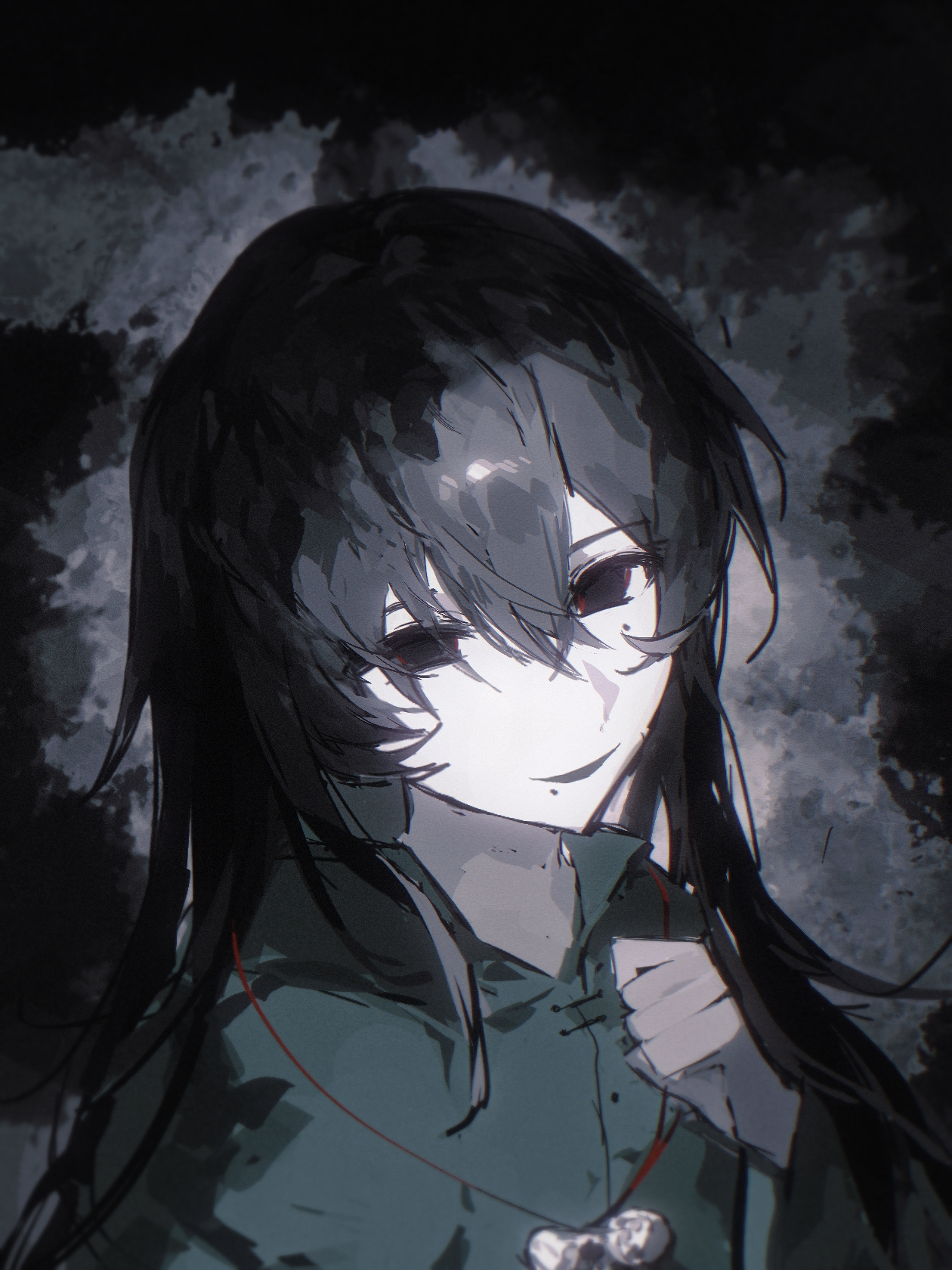 1boy a_bo black_hair chinese_commentary collared_shirt colored_skin commentary_request empty_eyes green_shirt hand_up highres long_hair male_focus mole mole_under_eye mole_under_mouth multiple_moles open_collar open_mouth portrait shirt smile solo touqi_guaitan white_skin zenme_zheyang