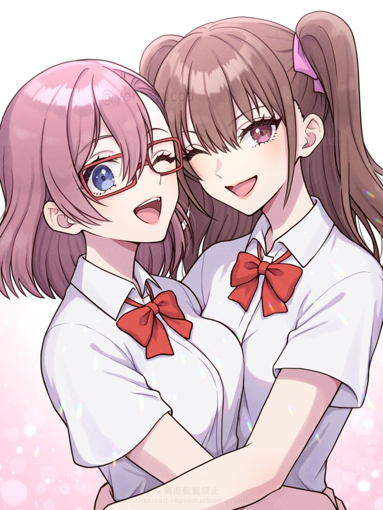 2.5_jigen_no_ririsa 2girls amano_ririsa breasts brown_hair glasses hair_between_eyes hair_ribbon hug large_breasts looking_at_viewer multiple_girls neck_ribbon open_mouth pink_eyes pink_hair purple_eyes red_ribbon ribbon school_uniform shirt short_hair sidelocks small_breasts smile tachibana_mikari teeth twintails upper_teeth_only white_shirt yamayucca