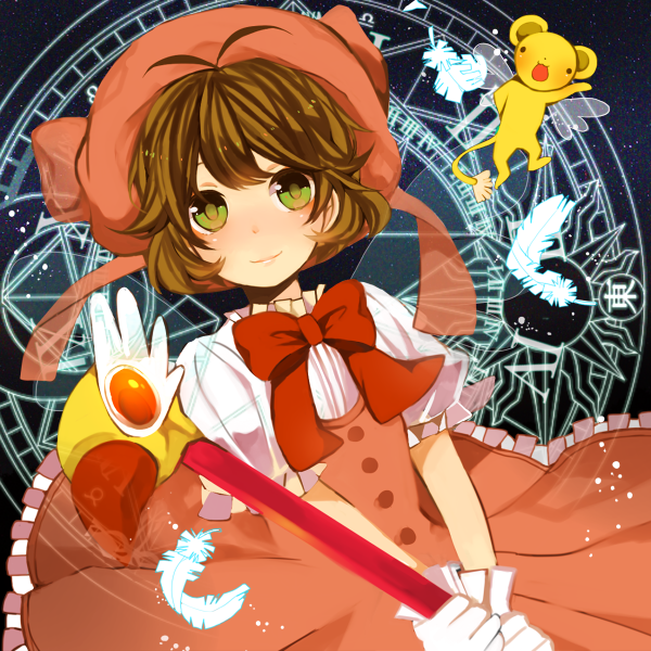 1990s_(style) 1girl blush bow brown_hair cardcaptor_sakura child dress feathers female_focus fuuin_no_tsue gloves green_eyes hat kero_(cardcaptor_sakura) kinomoto_sakura kinomoto_sakura_(magician) komine magic_circle magical_girl pink_hat retro_artstyle ribbon short_hair smile solo wand white_gloves