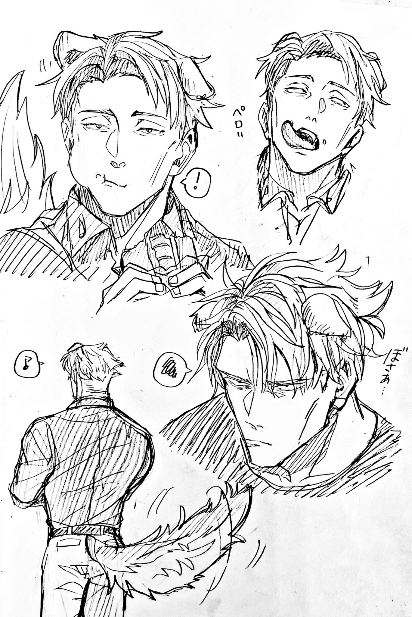 ! 1boy animal_ears belt cowboy_shot dog_ears dog_tail eating food from_behind highres holding holding_food jujutsu_kaisen long_sleeves male_focus monochrome musical_note nanami_kento nekonii open_mouth pants portrait shirt short_hair sketch speech_bubble tail tail_wagging teeth tongue upper_teeth_only