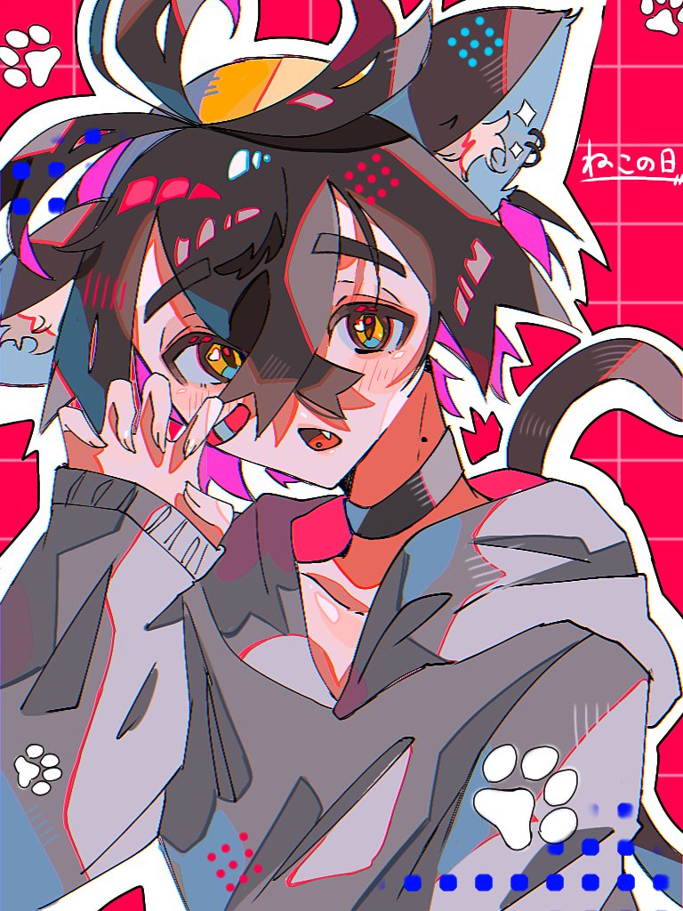 1boy alternate_costume animal_ear_fluff animal_ear_piercing animal_ears bandaid bandaid_on_cheek bandaid_on_face black_choker black_hair black_tail cat_boy cat_day cat_ears cat_tail choker claw_pose colored_inner_hair crossed_bangs fang fingernails grey_hoodie grid_background hair_between_eyes hairband hami_(3hm6gebdf619771) hood hood_down hoodie kemonomimi_mode kieran_(pokemon) long_sleeves male_focus mole mole_on_neck multicolored_hair nintendo open_mouth piercing pink_hair pokemon pokemon_sv short_hair sleeves_past_wrists solo tail tail_raised tongue_piercing two-tone_hair yellow_eyes yellow_hairband