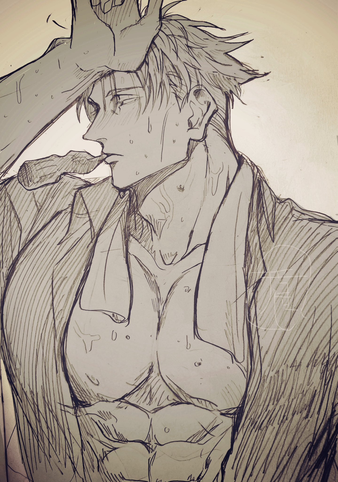 1boy abs collared_shirt highres jujutsu_kaisen large_pectorals male_focus monochrome mouth_hold muscular muscular_male nanami_kento nekonii open_clothes open_shirt pectorals shirt short_hair sketch solo towel towel_around_neck undercut upper_body