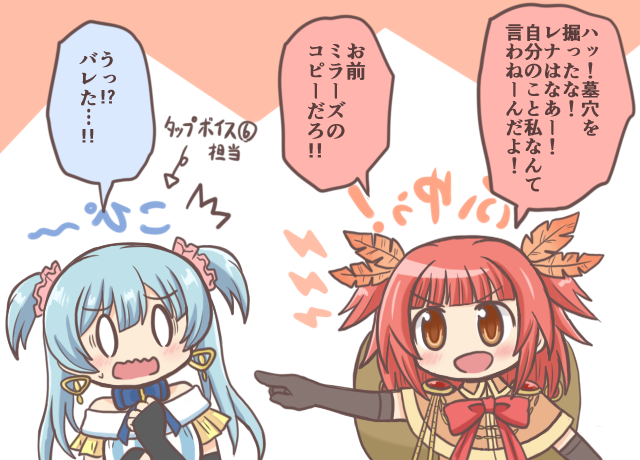 0_0 2girls :d akino_kaede bad_id bad_twitter_id black_gloves blue_hair blunt_bangs chibi commentary_request earrings gloves jewelry light_blue_hair long_hair looking_at_another magia_record:_mahou_shoujo_madoka_magica_gaiden magical_girl mahou_shoujo_madoka_magica minami_rena minami_rena_(magical_girl) multiple_girls open_mouth pointing pointing_at_another red_hair reverse_(bluefencer) smile speech_bubble translation_request two_side_up upper_body wavy_mouth