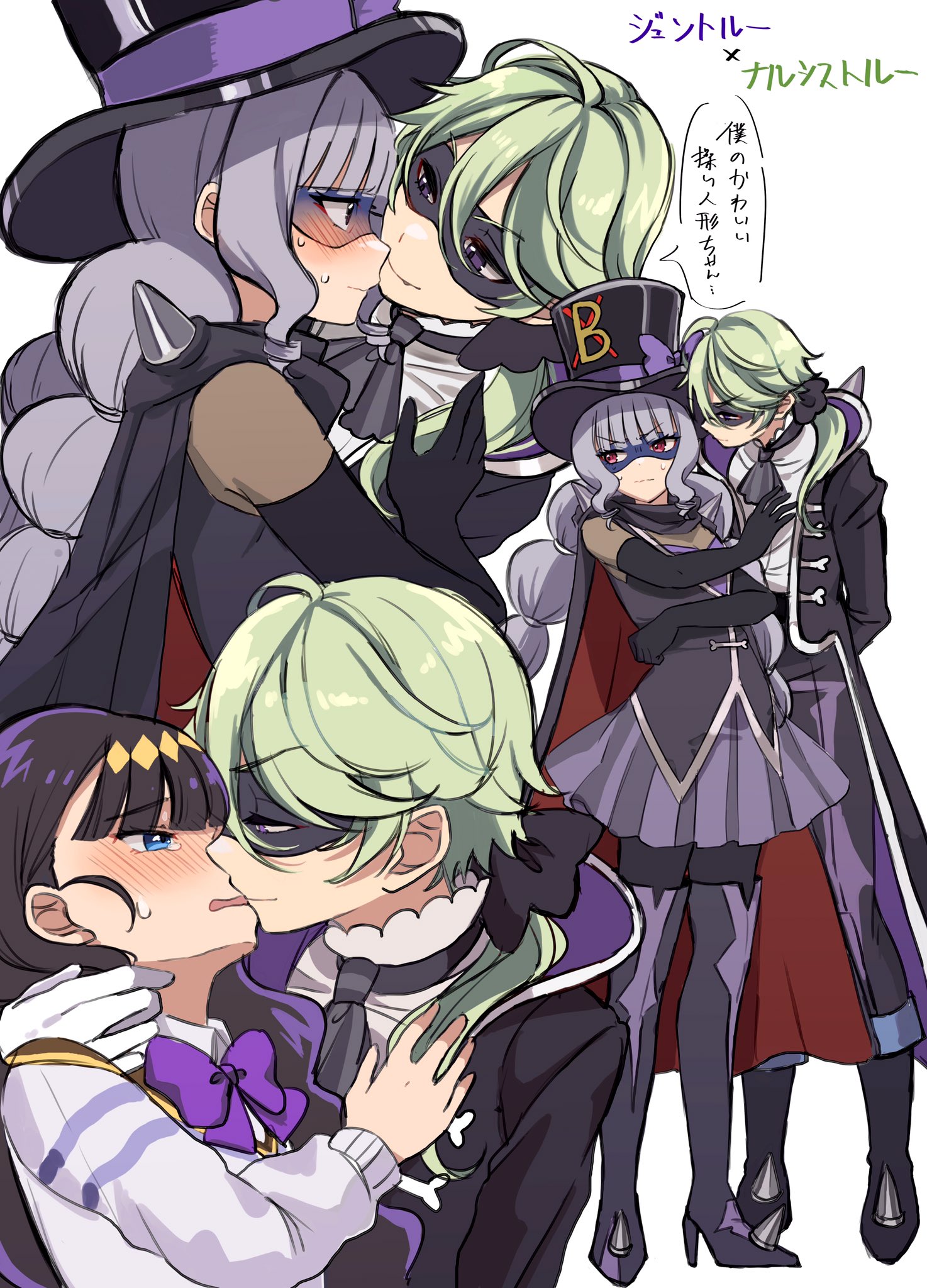 1boy 1girl black_bow black_coat black_gloves black_hair black_hat black_necktie black_pants black_pantyhose black_vest blue_eyes blunt_bangs blush boots bow braid breasts cardigan closed_mouth coat delicious_party_precure dress_shirt drill_hair elbow_gloves elbow_sleeve formal_clothes full_body gentlu_(precure) gloves green_hair grey_hair grey_skirt hat hat_bow hetero highres kasai_amane kiss long_hair long_sleeves low_ponytail miniskirt multiple_views narcistoru necktie open_clothes open_coat open_mouth pants pantyhose pauldrons pleated_skirt ponytail precure purple_bow purple_eyes purple_skirt pushing red_eyes school_uniform shinsen_middle_school_uniform shirt simple_background skirt sleeveless speech_bubble spiked_pauldrons spikes standing suit sweat tears thigh_boots top_hat twin_braids twin_drills twintails vest white_background white_cardigan white_shirt yumi_san0112