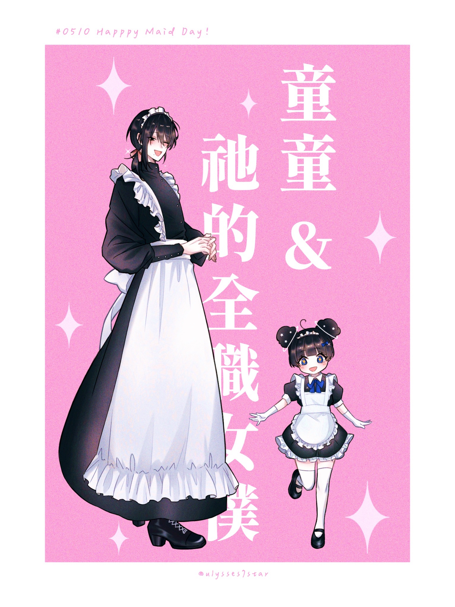 1boy 1girl alternate_costume apron black_dress black_eyes black_hair black_shoes blue_eyes blue_ribbon bow child chinese_commentary commentary_request double_bun dress enmaided frilled_dress frills full_body gloves hair_bow hair_bun highres leg_up long_sleeves maid maid_apron maid_day maid_headdress mo_chengwei mole mole_under_eye neck_ribbon one_eye_closed open_mouth puffy_long_sleeves puffy_sleeves ribbon shoes smile sparkling_eyes thighhighs tong_lingshen touqi_guaitan translation_request ulysses7star white_apron white_gloves white_thighhighs