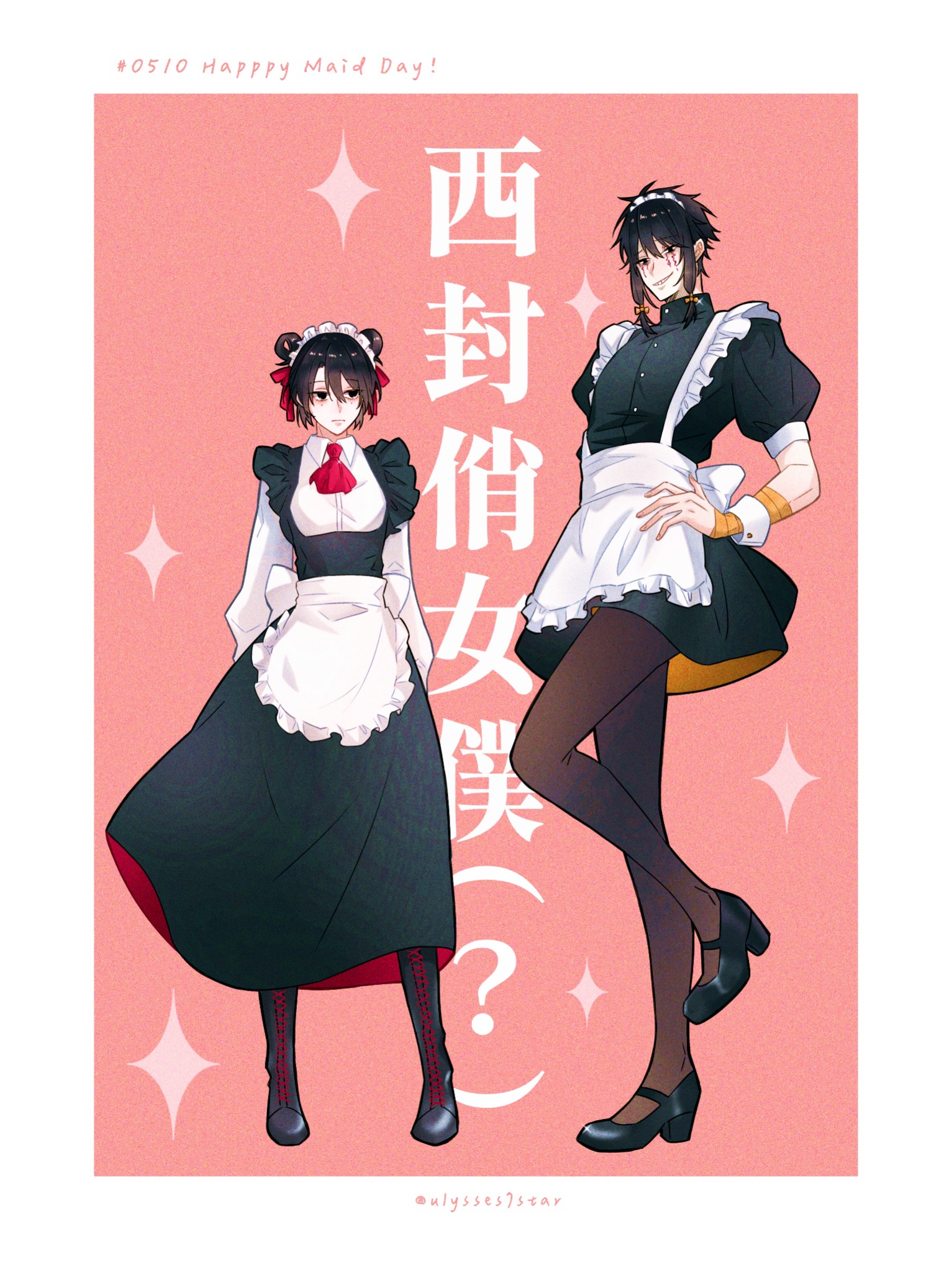 1boy 1girl alternate_costume apron ascot black_boots black_dress black_eyes black_hair black_shoes boots bow brown_pantyhose chinese_commentary closed_mouth collared_shirt commentary_request crossdressing crossdressing_(mtf) dress enmaided facial_tattoo foot_up frilled_apron frills full_body grin hair_bow hair_ribbon hair_rings hand_on_own_hip highres li_yuting_(female) long_sleeves maid maid_day maid_headdress mole mole_under_each_eye mole_under_eye multiple_moles pantyhose puffy_short_sleeves puffy_sleeves red_ascot red_ribbon ribbon shirt shoes short_hair short_sleeves smile tattoo touqi_guaitan translation_request ulysses7star white_apron white_shirt wrist_cuffs yellow_bow ziche_fuzhao