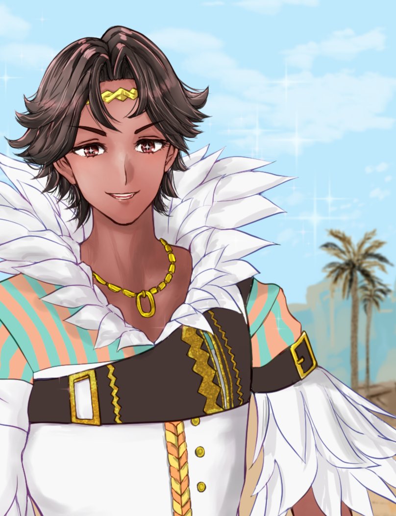 1boy blue_sky brown_eyes brown_hair circlet dark-skinned_male dark_skin feather_collar feather_trim fire_emblem fire_emblem_engage fogado_(fire_emblem) gold_circlet gold_necklace jewelry looking_at_viewer male_focus marie_dqx necklace nintendo palm_tree prince short_hair sky smile star-shaped_pupils star_(symbol) symbol-shaped_pupils tree very_dark_skin