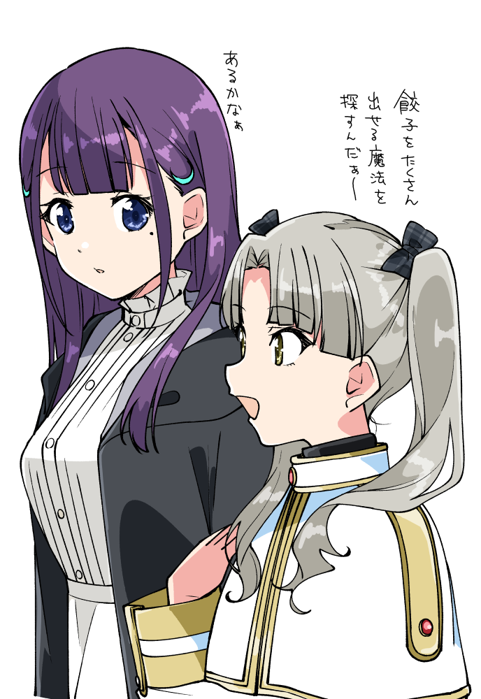 22/7 2girls :d alternate_costume alternate_hairstyle black_bow black_coat bow center-flap_bangs coat cosplay dress fanged_bangs fern_(sousou_no_frieren) fern_(sousou_no_frieren)_(cosplay) frieren frieren_(cosplay) grey_eyes grey_hair hair_bow hair_ornament ichinose_hotaru long_hair mole mole_under_eye multiple_girls nagamine_kaede open_mouth parted_bangs plaid_bow purple_eyes purple_hair simple_background smile sousou_no_frieren trefle_r twintails upper_body white_background white_dress