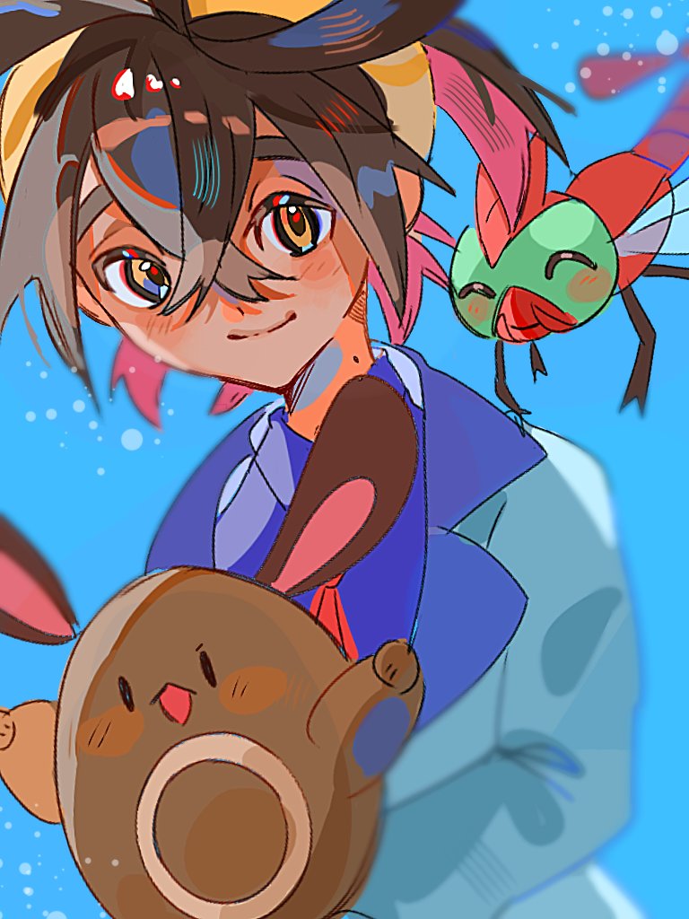1boy black_hair blue_background blue_shirt closed_mouth collared_shirt colored_inner_hair crossed_bangs gen_2_pokemon hair_between_eyes hairband hami_(3hm6gebdf619771) jacket kieran_(pokemon) mole mole_on_neck multicolored_hair necktie nintendo pink_hair pokemon pokemon_(creature) pokemon_sv red_necktie sentret shirt smile two-tone_hair white_jacket yanma yellow_eyes yellow_hairband