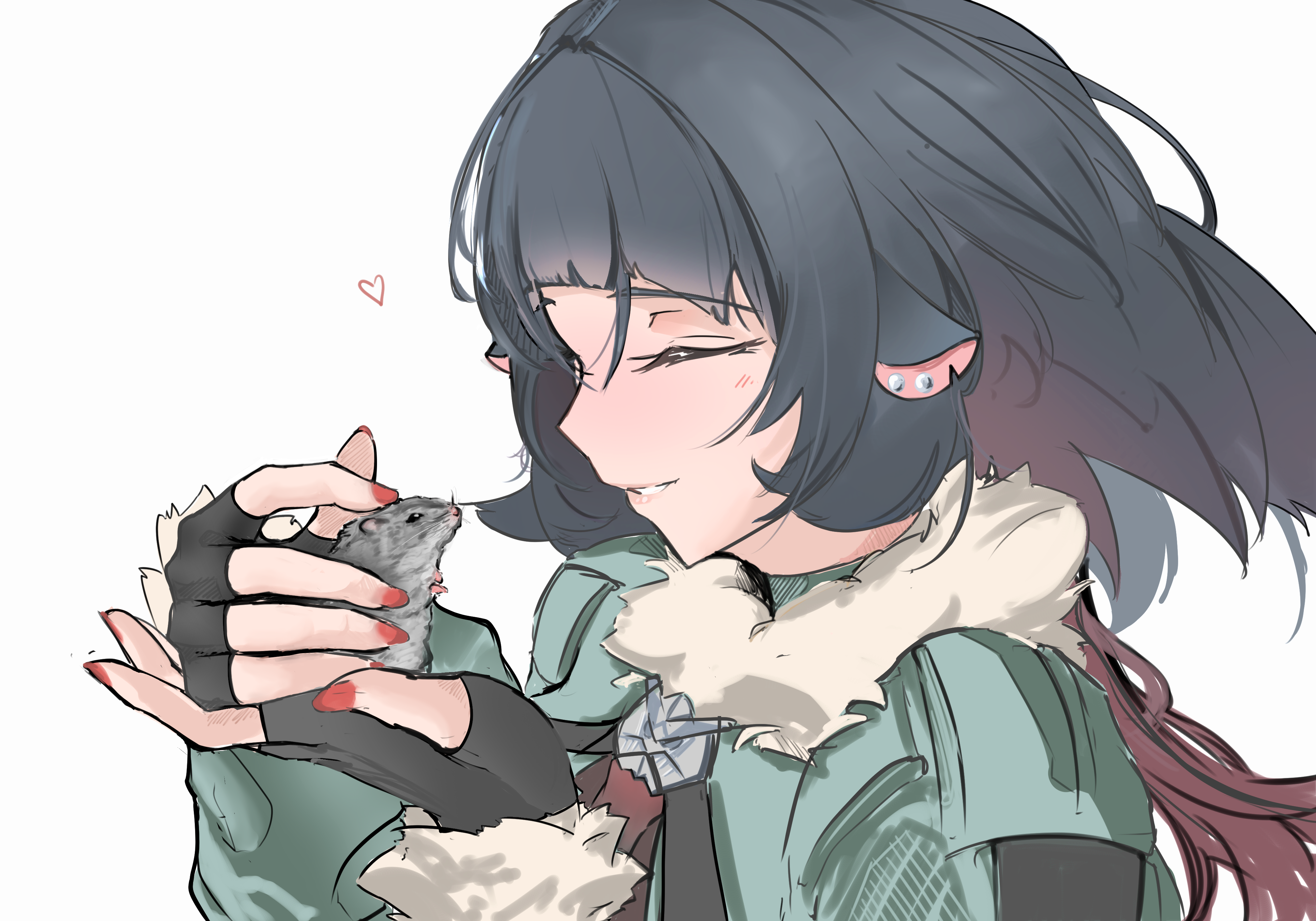 1girl absurdres animal animal_ears black_gloves black_hair closed_eyes collared_jacket commentary earrings english_commentary facing_another fingerless_gloves fingernails fur-trimmed_sleeves fur_collar fur_trim gloves green_jacket hands_up heart highres holding holding_animal jacket jane_doe_(zenless_zone_zero) jewelry lips long_hair long_sleeves mouse_ears mouse_girl multicolored_hair nail_polish parted_lips red_hair red_nails simple_background smile stud_earrings two-tone_hair weebchair zenless_zone_zero