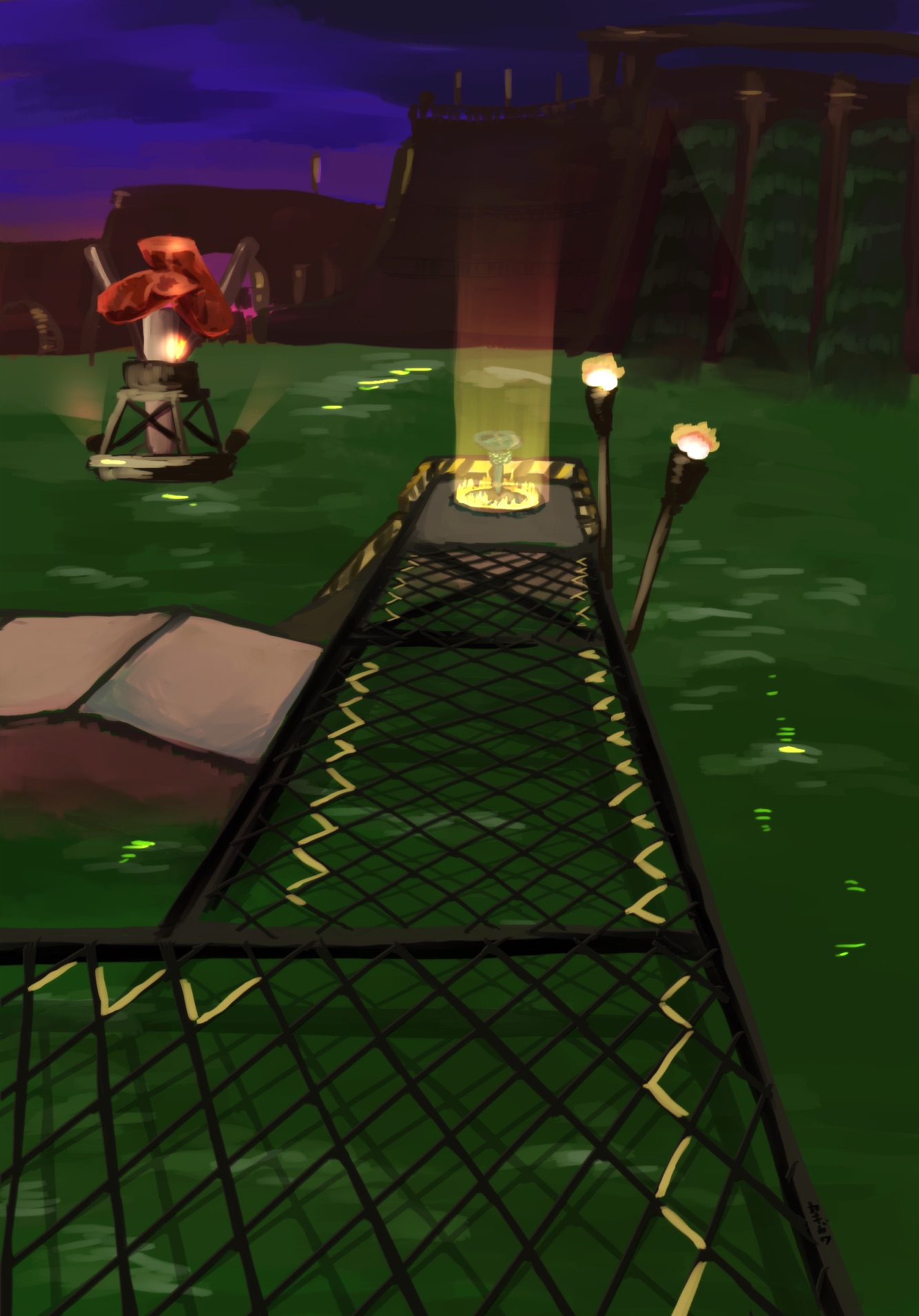cloud dam ebifurai_kakigwa food glowing grate highres in-universe_location light_rays night nintendo no_humans outdoors oversized_food oversized_object purple_sky salmon_run_(splatoon) sausage scenery sky splatoon_(series) torch water