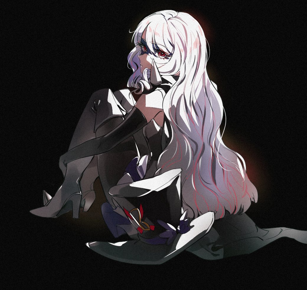 alternate_hairstyle black_background black_boots black_cape black_gloves black_hat black_pantyhose black_vest bodysuit boots bow cape delicious_party_precure drill_hair elbow_gloves elbow_sleeve gentlu_(precure) gloves grey_hair hair_down hat hat_bow high_heel_boots high_heels hugging_own_legs kasai_amane long_hair looking_at_viewer looking_back mask nirin pantyhose pauldrons precure red_eyes simple_background sitting sleeveless spiked_footwear spiked_pauldrons spikes thigh_boots top_hat vest white_hair