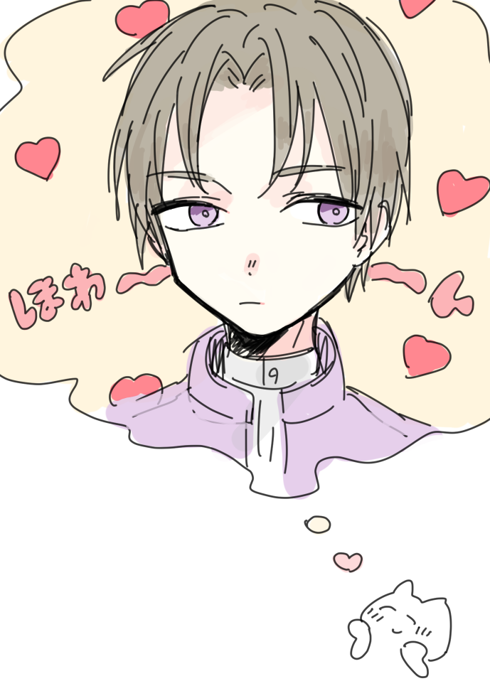 1boy artist_self-insert blush bright_pupils brown_hair closed_eyes closed_mouth dot_nose heart heshikiri_hasebe makyuuu_(mmdy) male_focus purple_eyes purple_shirt shirt short_hair smile speech_bubble thought_bubble touken_ranbu translation_request white_pupils