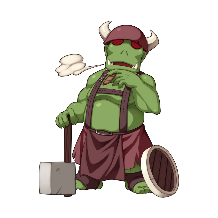 1boy axe brown_sandals brown_skirt chibi chibi_only cigar colored_sclera colored_skin fake_horns full_body green_skin helmet holding holding_axe holding_cigar horned_helmet horns looking_at_viewer male_focus no_pupils official_art open_mouth orc orc_warrior_(ragnarok_online) pelvic_curtain pointy_ears ragnarok_online red_sclera sandals shield simple_background skirt smoking solo suspenders topless_male transparent_background tusks yuichirou