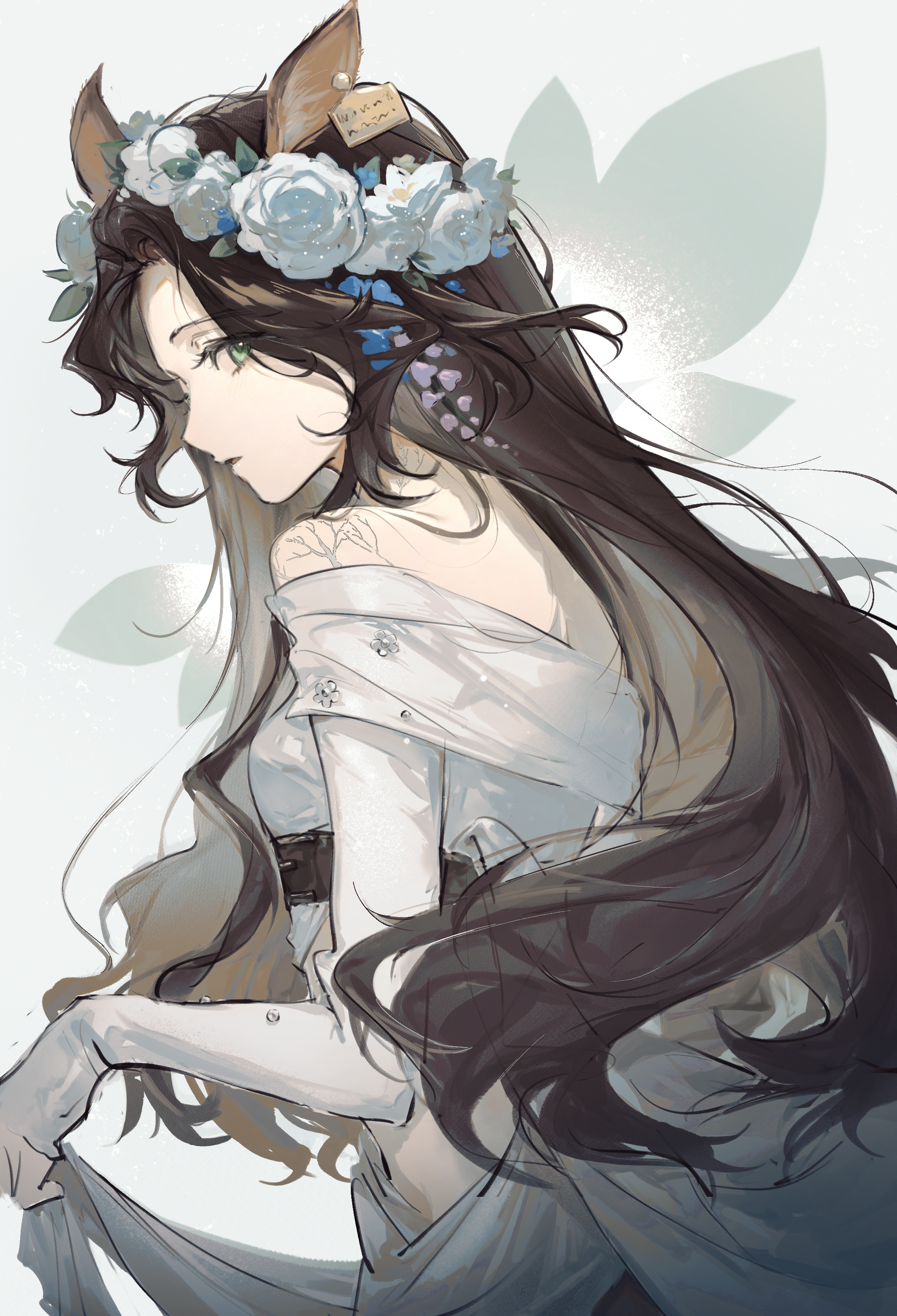 1girl absurdres animal_ears brown_hair deer_ears deer_girl dress ear_tag female_focus fmttm42 green_eyes grey_background head_wreath highres jessica_(reverse:1999) long_hair looking_at_viewer looking_back off_shoulder reverse:1999 solo upper_body white_dress
