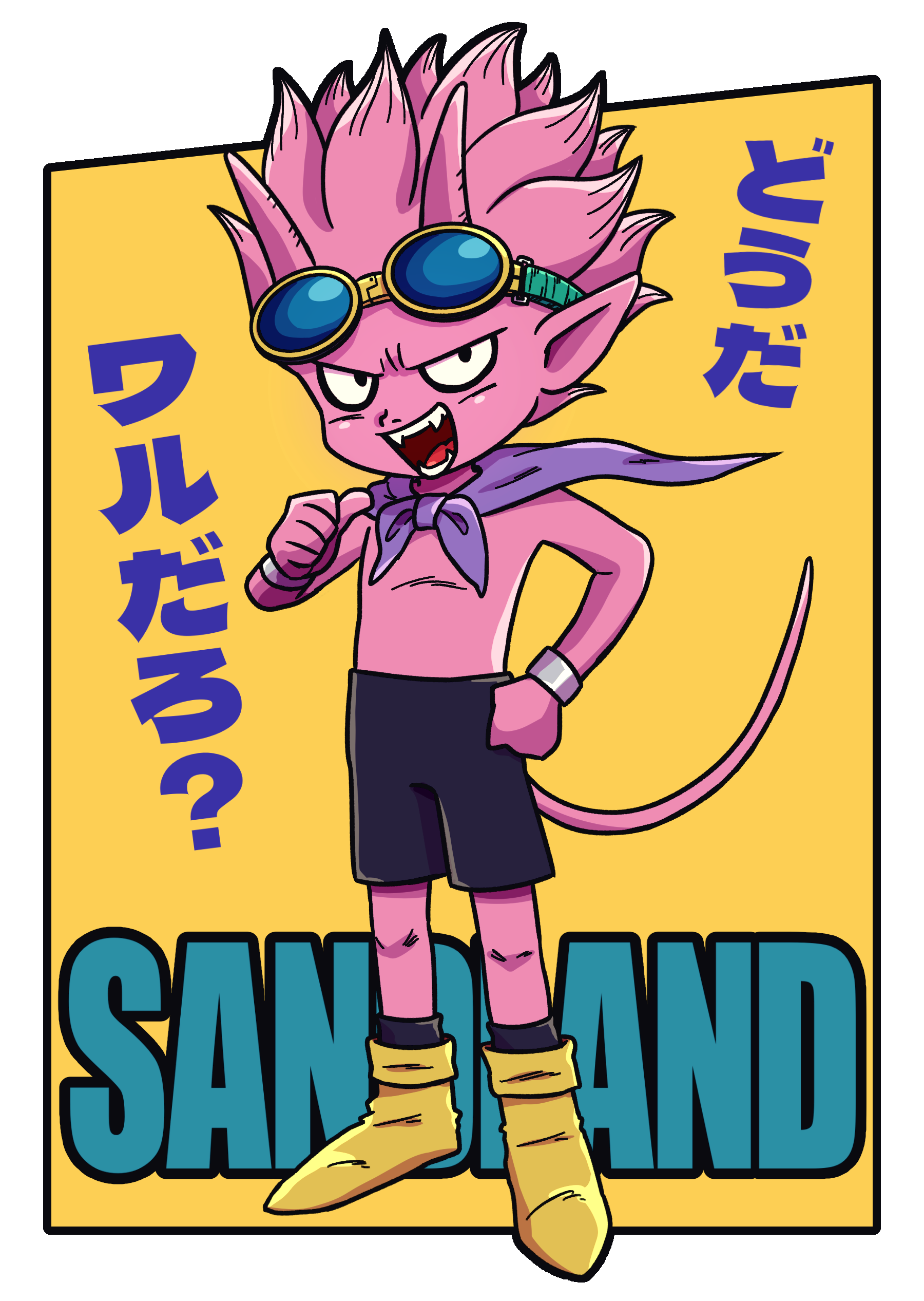 1boy absurdres beelzebub_(sand_land) black_eyes black_shorts black_socks boots border bracelet cape colored_skin commentary_request copyright_name demon_boy fangs goggles goggles_on_head hand_on_own_hip highres horns jewelry kibao3 looking_at_viewer male_focus open_mouth pink_hair pink_horns pink_skin pointing pointing_at_self pointing_with_thumb pointy_ears purple_cape sand_land shorts silver_bracelet socks solo spiked_hair tail tongue translation_request white_border yellow_boots