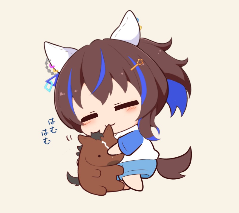 1girl :3 animal_ears barefoot biting blue_hair blue_shorts blush brown_background brown_hair chibi closed_eyes closed_mouth commentary_request daitaku_helios_(umamusume) biting_ear facing_viewer gomashio_(goma_feet) hair_between_eyes hair_ornament hairclip horse_ears horse_girl horse_tail mejiro_palmer_(racehorse) multicolored_hair raglan_sleeves shirt short_sleeves shorts side_ponytail simple_background star_(symbol) star_hair_ornament streaked_hair tail translation_request umamusume white_shirt