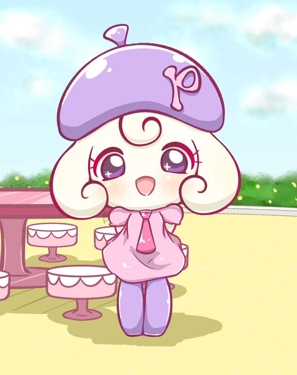 1girl asafiy beret chibi chibi_only commentary dress hat highres looking_at_viewer necktie open_mouth outdoors pianitchi pink_dress pink_necktie purple_eyes purple_hat smile solo standing table tamagotchi tamagotchi!_(anime) tamagotchi!_yume_kira_dream tamagotchi_(creature)