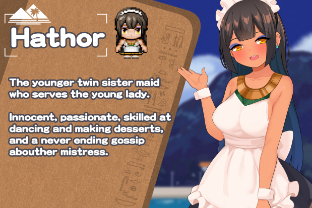 1girl apron bare_arms bare_shoulders black_hair blurry blurry_background blush breasts character_name character_profile colored_inner_hair dark-skinned_female dark_skin day dress english_text hathor_(lady_and_the_papyrus) lady_and_the_papyrus large_breasts long_hair looking_at_viewer maid maid_apron maid_headdress mountain multicolored_hair multiple_girls official_art open_mouth sleeveless sleeveless_dress solo surio teeth upper_teeth_only very_long_hair waist_apron white_apron white_wrist_cuffs wrist_cuffs yellow_eyes
