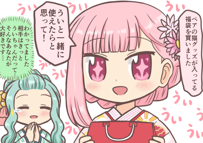 +_+ 2girls :d bad_id bad_twitter_id bangs_pinned_back blunt_bangs closed_eyes commentary_request flower futaba_sana futaba_sana_(haregi_costume) hair_flower hair_ornament hands_up japanese_clothes kimono long_hair long_sleeves looking_at_viewer magia_record:_mahou_shoujo_madoka_magica_gaiden mahou_shoujo_madoka_magica multiple_girls open_mouth own_hands_clasped own_hands_together pink_eyes pink_flower pink_hair pink_kimono print_kimono reverse_(bluefencer) sidelocks single_sidelock smile speech_bubble tamaki_iroha tamaki_iroha_(haregi_costume) tearing_up translation_request upper_body wavy_hair