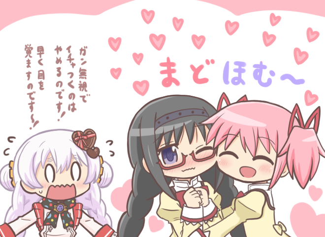 0_0 3girls ^_^ akemi_homura bad_id bad_twitter_id black_hair braid cheek-to-cheek closed_eyes collared_shirt commentary_request flying_sweatdrops glasses hair_ribbon hairband hands_up heads_together heart hug juliet_sleeves kaname_madoka long_hair long_sleeves magia_record:_mahou_shoujo_madoka_magica_gaiden mahou_shoujo_madoka_magica mahou_shoujo_madoka_magica:_hangyaku_no_monogatari mitakihara_school_uniform momoe_nagisa momoe_nagisa_(valentine_ver.) multiple_girls open_mouth own_hands_together pink_hair puffy_sleeves purple_eyes red-framed_eyewear reverse_(bluefencer) ribbon school_uniform shirt short_hair short_twintails smile surprised sweater translation_request twin_braids twintails upper_body wavy_mouth white_hair white_shirt yellow_sweater yuri