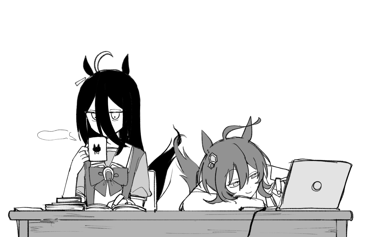 2girls agnes_tachyon_(umamusume) book bow bowtie chemical_structure coffee_mug computer cup ear_tag earrings greyscale hair_between_eyes head_on_table head_rest high_collar horse_girl horse_tail jewelry laptop long_bangs long_hair_between_eyes manhattan_cafe_(umamusume) medium_hair monochrome mug multiple_girls no_mouth open_book puffy_short_sleeves puffy_sleeves reading saezurippp sailor_collar sailor_shirt school_uniform serafuku shirt short_sleeves sidelocks simple_background single_earring smile steam table tail tail_wrap tracen_school_uniform umamusume white_background wolf_cut wooden_table