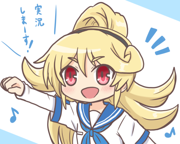 1girl :d arm_up bad_id bad_twitter_id black_hairband blonde_hair blue_neckerchief blue_sailor_collar breast_pocket commentary_request hairband hibiki_meguru layered_sleeves long_hair long_sleeves looking_at_viewer magia_record:_mahou_shoujo_madoka_magica_gaiden mahou_shoujo_madoka_magica minaminagi_liberty_academy_school_uniform musical_note neckerchief notice_lines open_mouth outstretched_arm pocket ponytail red_eyes reverse_(bluefencer) sailor_collar school_uniform serafuku shirt short_over_long_sleeves short_sleeves smile solo translation_request upper_body white_background white_shirt