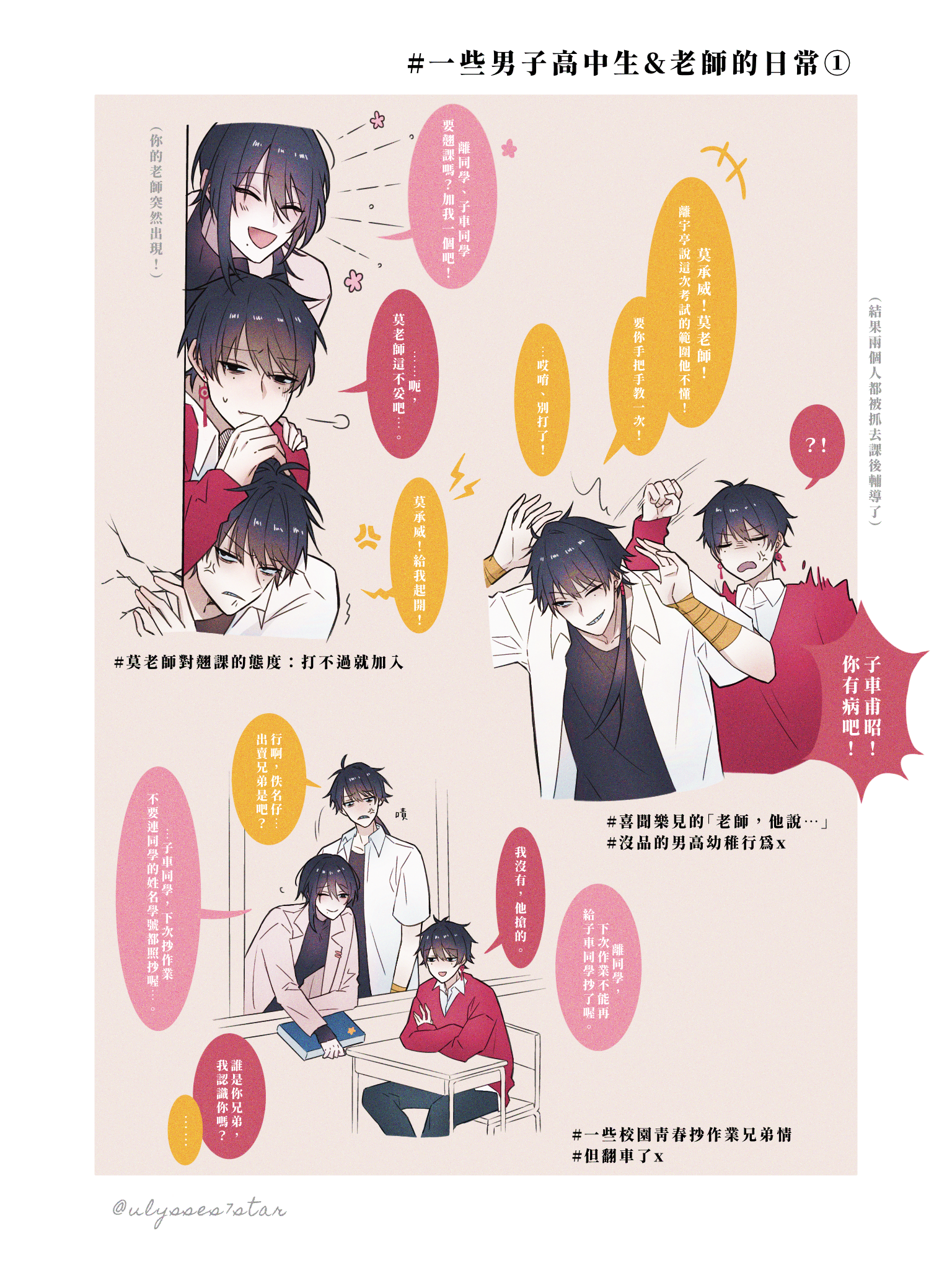 !? 3boys ;) adapted_costume anger_vein bandaged_wrist bandages black_footwear black_hair black_shirt chair chinese_commentary chinese_text closed_eyes closed_mouth collared_shirt commentary_request crossed_arms desk earrings happy_aura highres jacket jewelry li_yuting_(male) lofter_username long_sleeves male_focus mo_chengwei mole mole_under_each_eye mole_under_eye mole_under_mouth multiple_boys multiple_moles on_chair one_eye_closed open_clothes open_jacket open_mouth open_shirt pink_jacket red_sweater school_desk shirt short_hair sitting smile spoken_interrobang sweat sweater touqi_guaitan translation_request ulysses7star white_shirt ziche_fuzhao