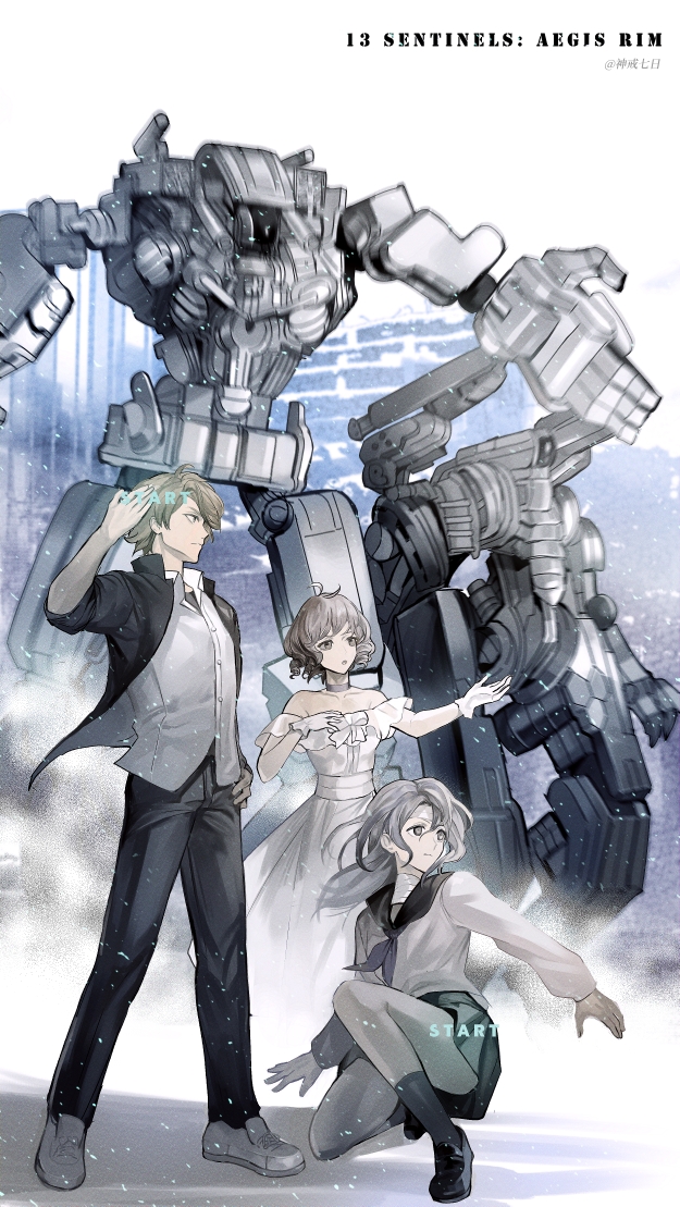 1boy 2girls 949805342 amiguchi_shuu bandaged_head bandaged_neck bandages black_skirt blue_neckerchief brown_hair dress drill_hair frilled_dress frills gakuran glowing grey_hair grey_serafuku inaba_miyuki jacket juusan_kihei_bouei_ken mecha multiple_girls neckerchief non-humanoid_robot open_clothes open_jacket purple_neckerchief robot school_uniform science_fiction serafuku shinonome_ryouko_(juusan_kihei_bouei_ken) shirt skirt white_dress white_shirt