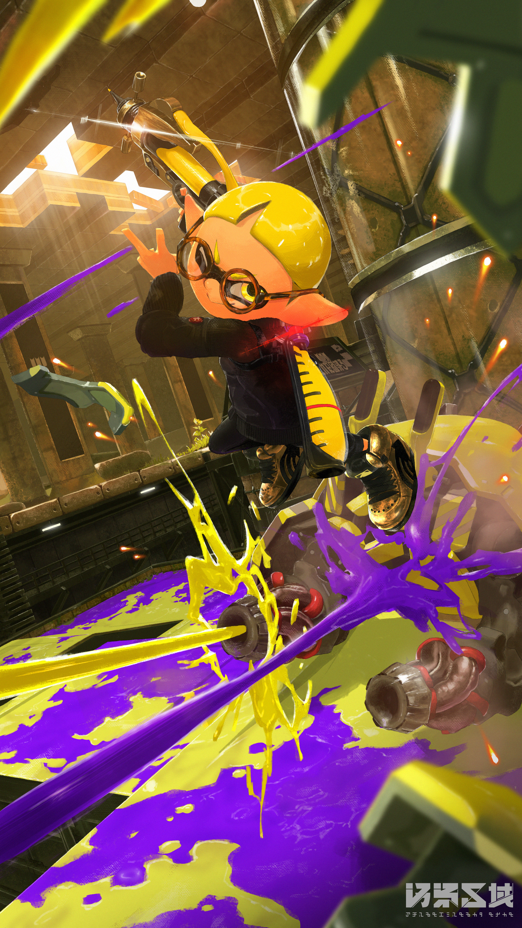 1boy :> absurdres arms_up black_pants black_sweater blonde_hair blunt_bangs blurry blurry_foreground bowl_cut closed_mouth crab_tank_(splatoon) dutch_angle firing full_body glasses glint gold_shoes happy highres holding holding_weapon in-universe_location ink_tank_(splatoon) inkling inkling_boy inkling_player_character jumping long_sleeves looking_at_viewer male_focus matching_hair/eyes nintendo one_eye_closed osen_kuiki pants pointy_ears round_eyewear shoes short_hair smile sneakers solo splash-o-matic_(splatoon) splatoon_(series) splatoon_3 splatter sweater tortoiseshell-framed_eyewear v-shaped_eyebrows watermark weapon yellow_eyes