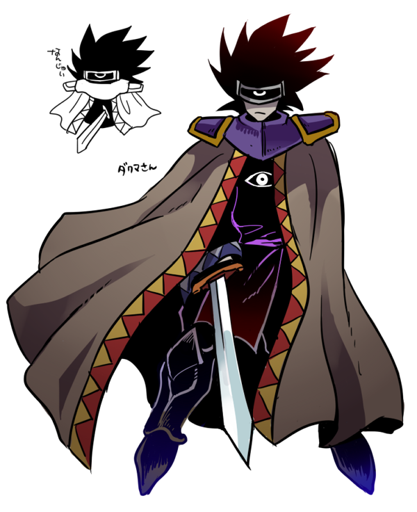 1boy armor black_hair black_pants black_skirt blue_footwear brown_cloak brown_tunic character_name cloak commentary_request creature_and_personification dark_matter_(kirby) dark_matter_blade eye_mask full_body greaves grey_mask holding holding_sword holding_weapon kirby_(series) long_sleeves male_focus mask mato_(mozu_hayanie) nintendo one-eyed pale_skin pants pauldrons personification sabaton short_hair shoulder_armor simple_background skirt sleeves_past_wrists spiked_hair sword translation_request triangle_print tunic weapon white_background wide_sleeves
