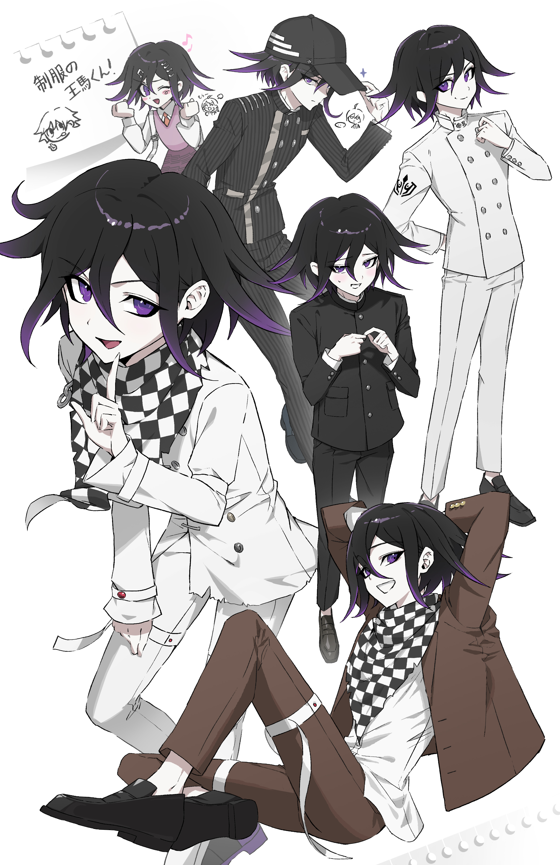 1boy absurdres akamatsu_kaede akamatsu_kaede_(cosplay) alternate_costume arm_belt black_hair buttons checkered_clothes checkered_scarf cosplay danganronpa_(series) danganronpa_v3:_killing_harmony double-breasted finger_to_mouth fist_pump flipped_hair gakuran hair_between_eyes hat highres ishimaru_kiyotaka ishimaru_kiyotaka_(cosplay) jacket korean_commentary long_sleeves looking_at_viewer male_focus multicolored_buttons oma_kokichi open_mouth pants purple_eyes purple_hair saihara_shuichi saihara_shuichi_(cosplay) scarf school_uniform shirt short_hair shushing simple_background smile straitjacket teeth ttegi_(ddeck_dg) two-tone_scarf white_background