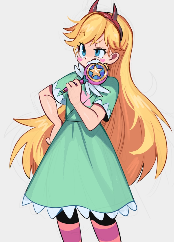 1girl blonde_hair blue_eyes commentary dress facial_mark fake_horns hairband heart heart_cheeks heart_facial_mark holding holding_wand horn_hairband horned_headwear horns long_hair markings nanika_(nnkgh) pantyhose simple_background solo star_butterfly star_vs_the_forces_of_evil star_wand striped_clothes striped_pantyhose untranslatable_commentary very_long_hair wand white_background
