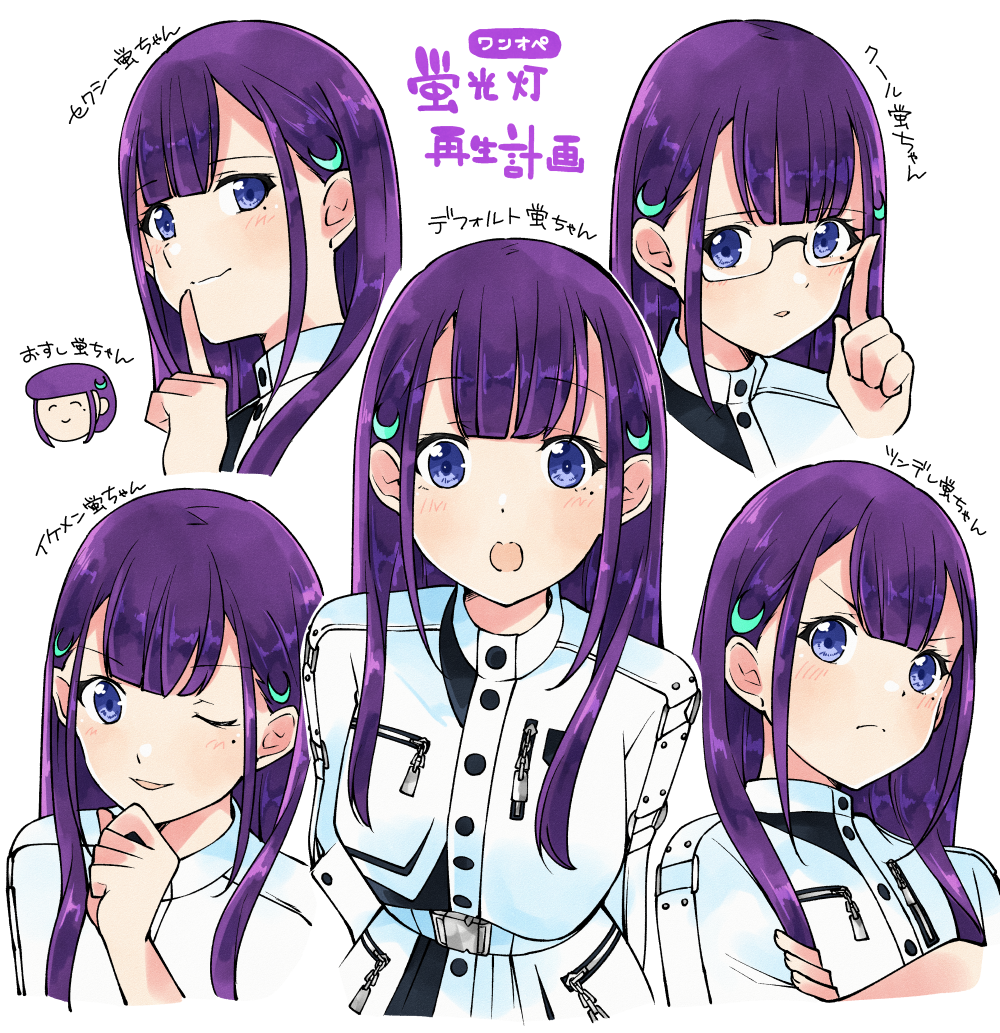 1girl 22/7 adjusting_eyewear black-framed_eyewear blush boku_wa_konya_deteiku center-flap_bangs closed_mouth dress fanged_bangs finger_to_mouth glasses hair_ornament ichinose_hotaru long_hair long_sleeves looking_at_viewer looking_to_the_side mole mole_under_eye multiple_views open_mouth purple_eyes purple_hair semi-rimless_eyewear simple_background trefle_r under-rim_eyewear white_background white_dress