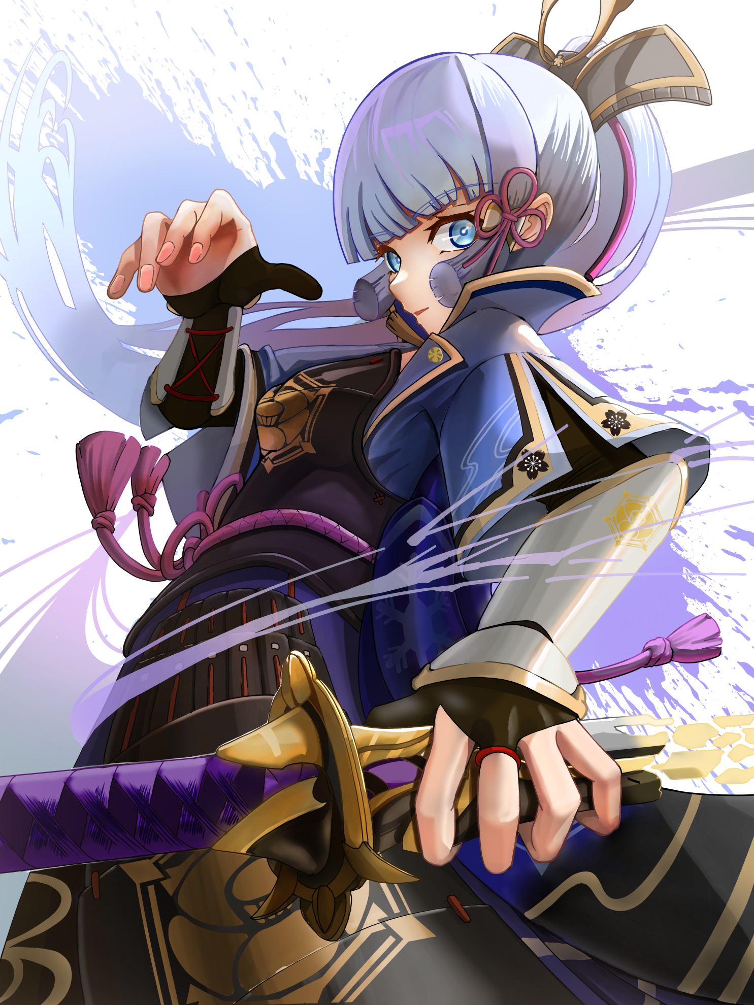 1girl ayaka_(genshin_impact) blue_hair genshin_impact highres kamisato_clan_(emblem) light_blue_hair mittanillust