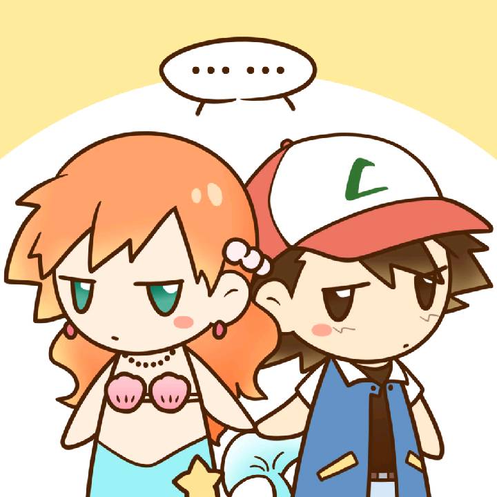 ... 1boy 1girl artist_request ash_ketchum asymmetrical_hair baseball_cap bikini bikini_top_only black_hair blush_stickers brown_eyes brown_hair chibi cosplay earrings gen_1_pokemon green_eyes hair_ornament hat jacket jewelry long_hair mermaid mermaid_misty_(pokemon) misty_(pokemon) monster_girl necklace nintendo orange_hair pokemon pokemon_(anime) pokemon_(classic_anime) ponytail seashell shell shell_bikini shirt short_hair side_ponytail source_request spoken_ellipsis star_(symbol) swimsuit