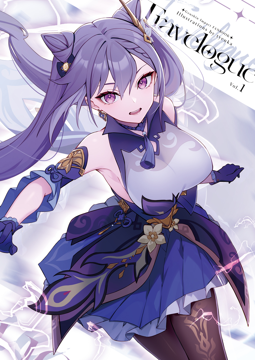1girl cone_hair_bun diamond-shaped_pupils diamond_(shape) dress english_text genshin_impact hair_bun hair_ears highres keqing_(genshin_impact) neck_tassel pantyhose purple_dress purple_eyes purple_hair solo symbol-shaped_pupils tassel tyenka7728