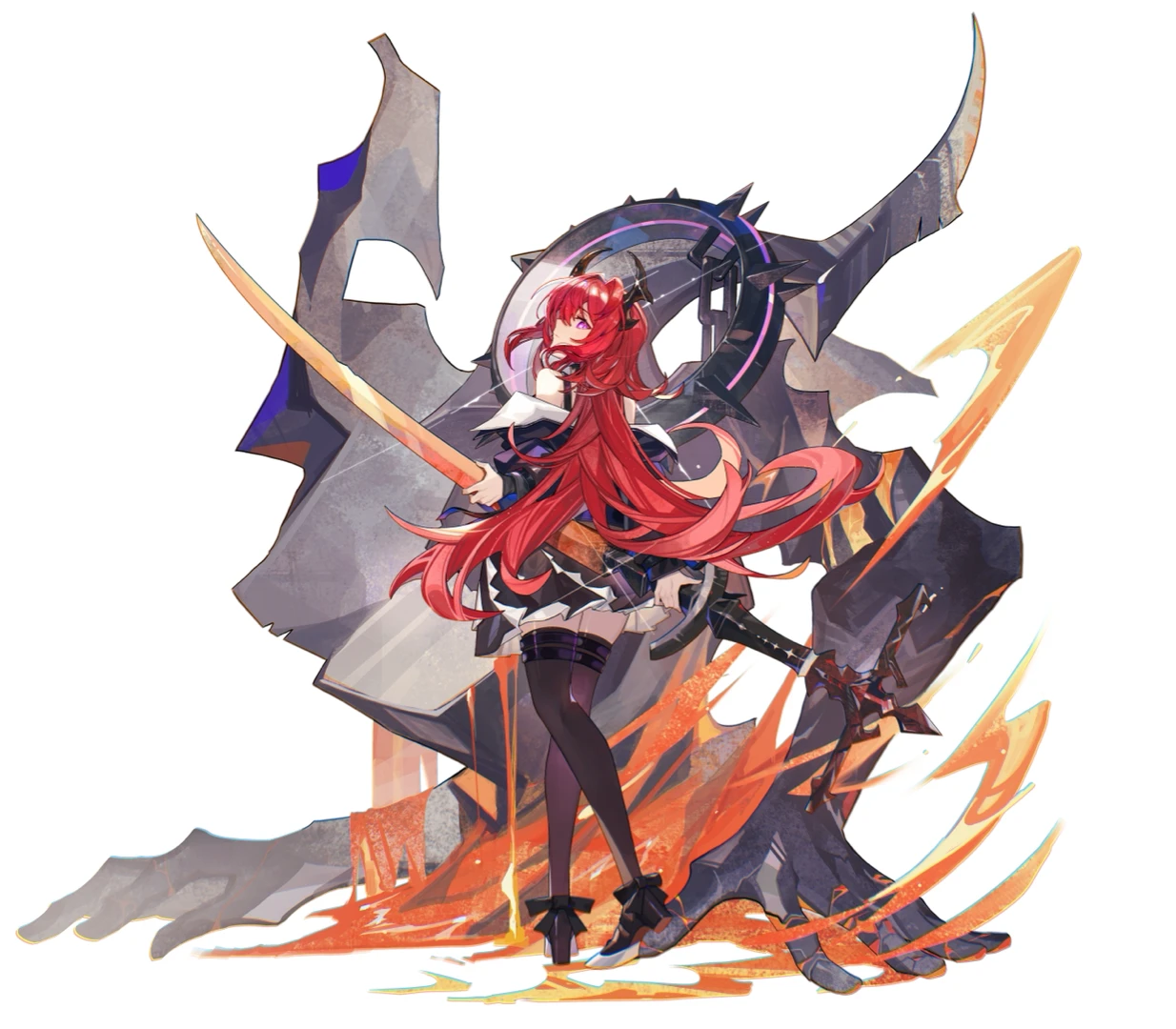 1girl acidinjection arknights bare_shoulders black_dress black_horns black_jacket black_shoes black_thighhighs chinese_commentary closed_mouth commentary_request dress fire from_behind full_body hair_intakes holding holding_sword holding_weapon horns huge_weapon jacket long_hair long_sleeves looking_at_viewer looking_back magic off_shoulder profile purple_eyes red_hair shoes short_dress solo sparkle standing surtr_(arknights) sword thighhighs weapon white_background