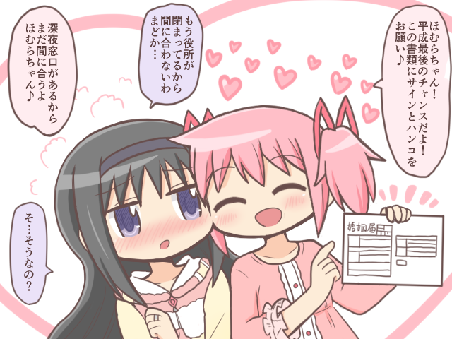 2girls :d ^_^ akemi_homura bad_id bad_twitter_id black_hair black_hairband blush cheek-to-cheek closed_eyes commentary_request cosplay dress hair_ribbon hairband heads_together heart holding holding_paper hood hood_down hooded_jacket jacket jewelry kaname_madoka long_hair looking_at_another magia_record:_mahou_shoujo_madoka_magica_gaiden mahou_shoujo_madoka_magica marriage_certificate_(object) multiple_girls open_mouth paper pink_dress pink_hair pointing purple_eyes reverse_(bluefencer) ribbon ring short_hair short_twintails smile speech_bubble tamaki_iroha tamaki_iroha_(cosplay) tamaki_iroha_(pajamas_costume) tamaki_ui tamaki_ui_(cosplay) tamaki_ui_(hospital_costume) translation_request twintails upper_body yuri