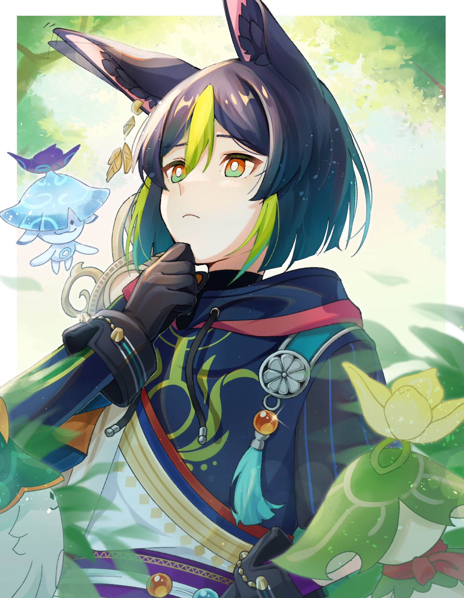 1boy animal_ear_fluff animal_ears aranara_(genshin_impact) black_hair fox_boy fox_ears fungi_(genshin_impact) genshin_impact green_eyes green_hair hair_between_eyes highres male_focus multicolored_hair short_hair solo streaked_hair tighnari_(genshin_impact) yuki_ma00