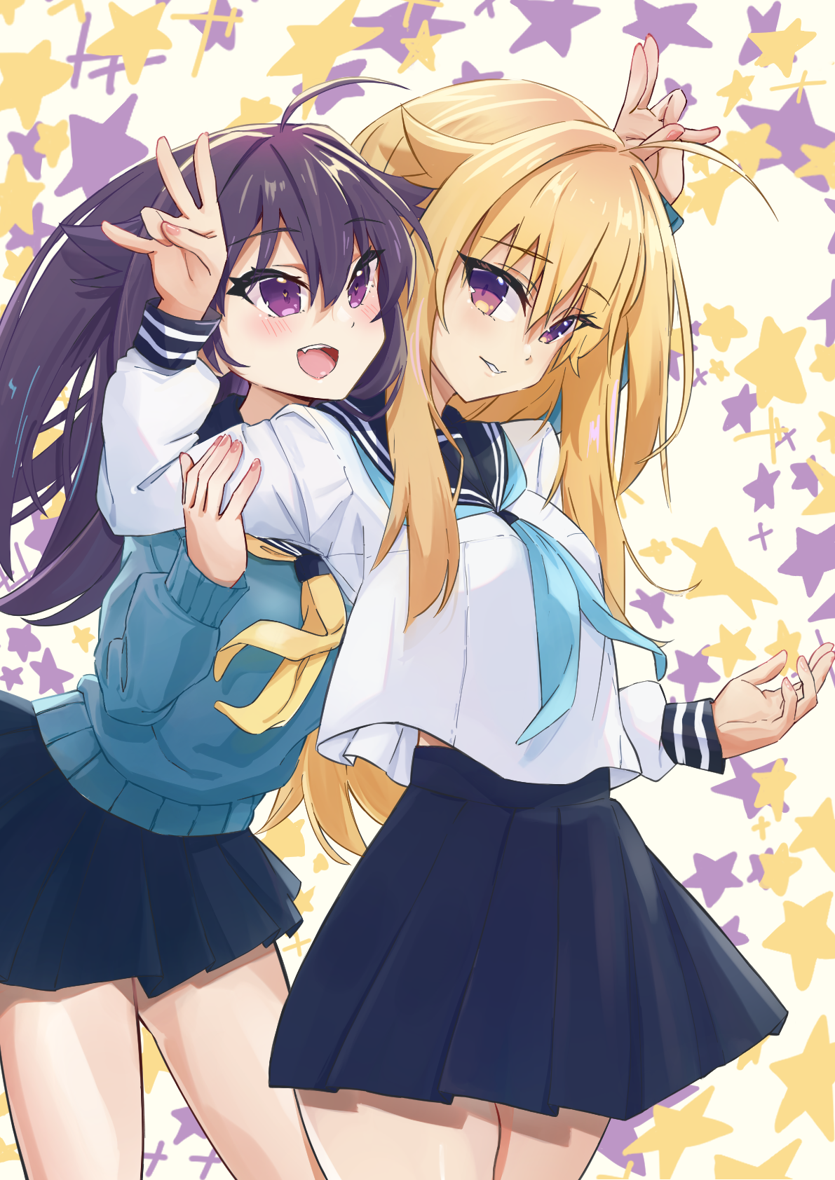 2girls ahoge arm_around_head blonde_hair blue_neckerchief blue_sailor_collar blue_skirt blush eyebrows eyelashes female_focus fingernails hair_between_eyes hand_up highres incest koshi_anko_(shikanoko) koshi_torako leaning_back leaning_forward long_hair multiple_girls nail_polish neckerchief pink_nails pleated_skirt purple_eyes purple_hair sailor_collar shikanoko_nokonoko_koshitantan siblings simple_background sisters skirt smile standing star_(symbol) teeth tongue upper_teeth_only white_background yuri