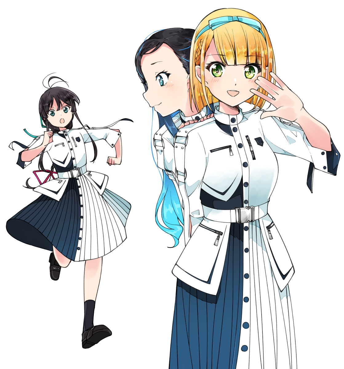 22/7 3girls :d antenna_hair aqua_eyes aqua_hair belt black_footwear black_hair black_socks blonde_hair blue_bow blue_hairband bob_cut boku_wa_konya_deteiku bow bow_hairband braid braided_ponytail clenched_hands dress gradient_hair green_eyes green_ribbon hair_bow hair_ribbon hairband hands_on_shoulders highres inverted_bob long_hair looking_at_another looking_at_viewer multicolored_dress multicolored_hair multiple_girls nishiura_sora open_hand open_mouth pleated_dress red_ribbon ribbon running saito_nicole short_hair sidelocks simple_background single_braid smile socks trefle_r white_background white_belt yagami_toa