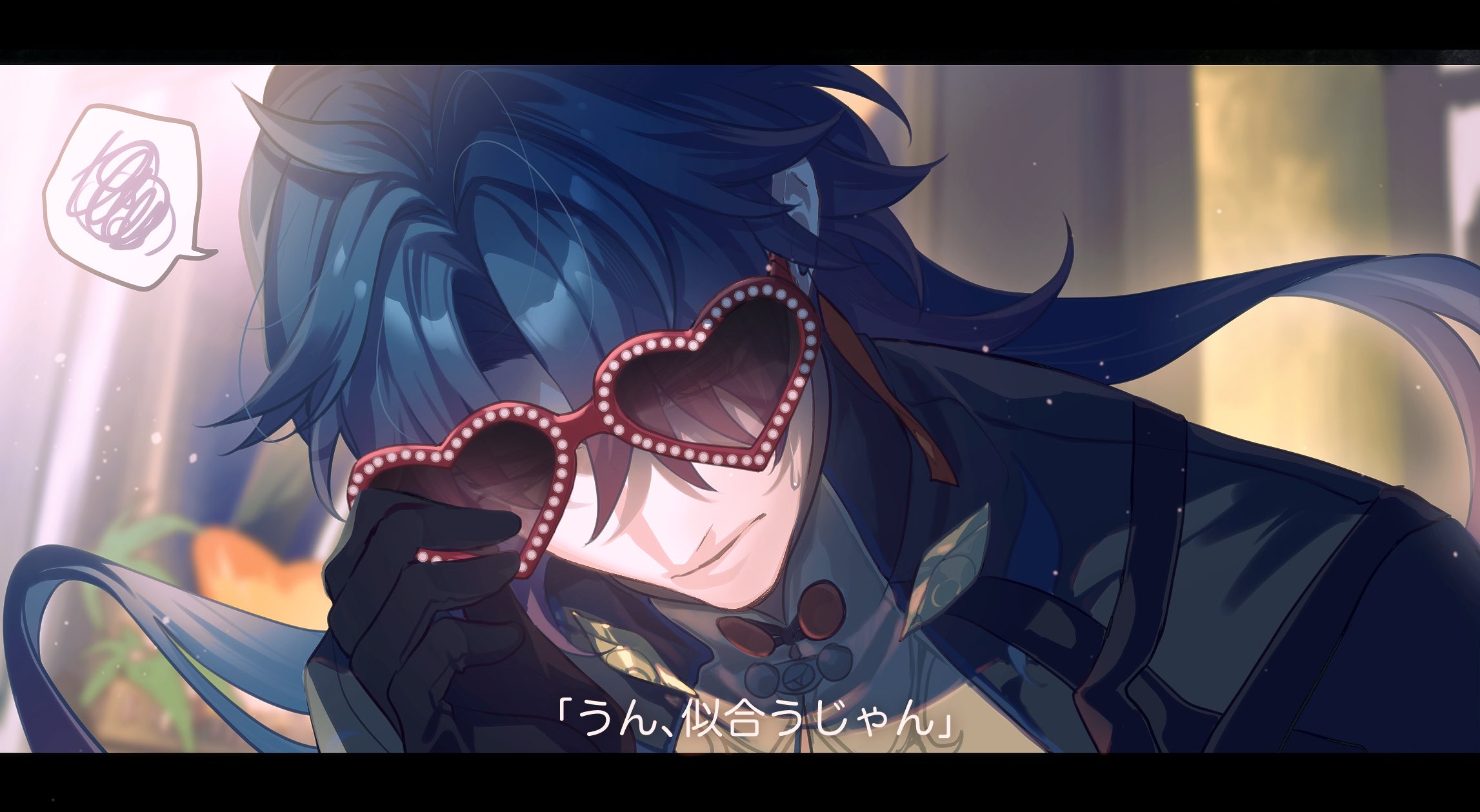 1boy adjusting_eyewear band_(music) blade_(honkai:_star_rail) blue_hair chinese_clothes closed_eyes curtained_hair dark_blue_hair earrings heart heart-shaped_eyewear highres honkai:_star_rail honkai_(series) jewelry long_hair male_focus shared_thought_bubble single_earring speech_bubble sweatdrop thought_bubble translation_request upper_body zassyoku_dd