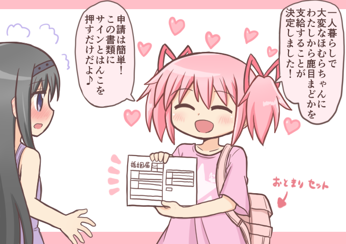 2girls :d ^_^ akemi_homura arrow_(symbol) bad_id bad_twitter_id black_hair blush closed_eyes commentary_request hair_ribbon heart holding holding_paper kaname_madoka long_hair looking_at_another mahou_shoujo_madoka_magica mahou_shoujo_madoka_magica_(anime) marriage_certificate_(object) multiple_girls open_mouth paper pink_bag pink_hair pink_shirt purple_eyes reverse_(bluefencer) ribbon shirt short_hair short_sleeves short_twintails smile speech_bubble translation_request twintails upper_body yuri